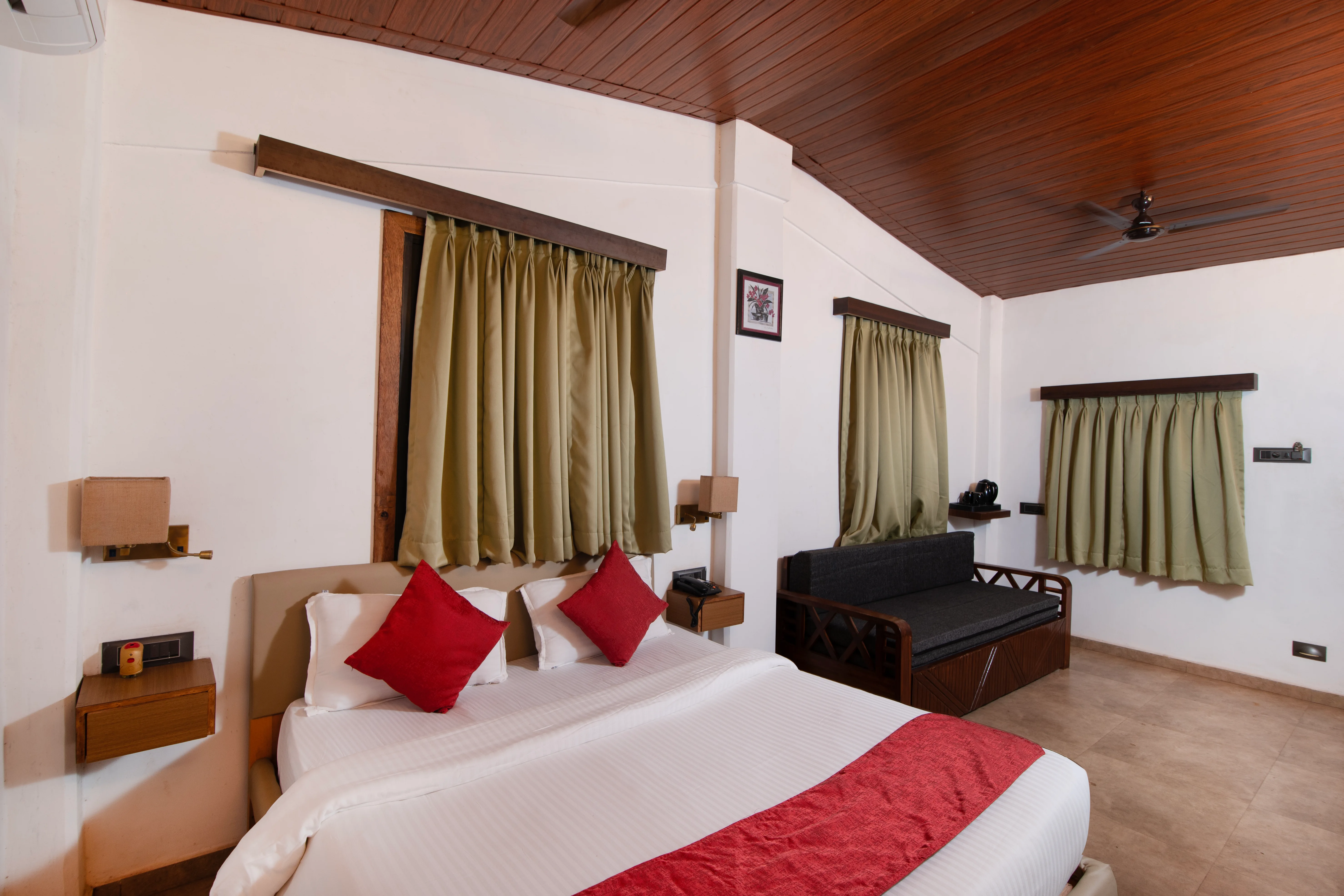 Experience a perfect blend of tradition and modern luxury in our Executive Rooms at our resort. With expansive layouts and separate living spaces, these rooms are ideal for discerning travelers and extended stays. Inspired by the rustic charm of Alibaug’s village culture, the interiors combine traditional aesthetics with modern comforts for a unique, immersive experience. Each room includes air conditioning, a work desk, a cozy seating nook, a tea/coffee maker, plush bedding, and high-speed Wi-Fi, along with ample storage and elegant decor. Perfect for both corporate and leisure travelers, the Executive Rooms offer the right balance of comfort, style, and cultural charm, making every stay at our resort truly unforgettable.